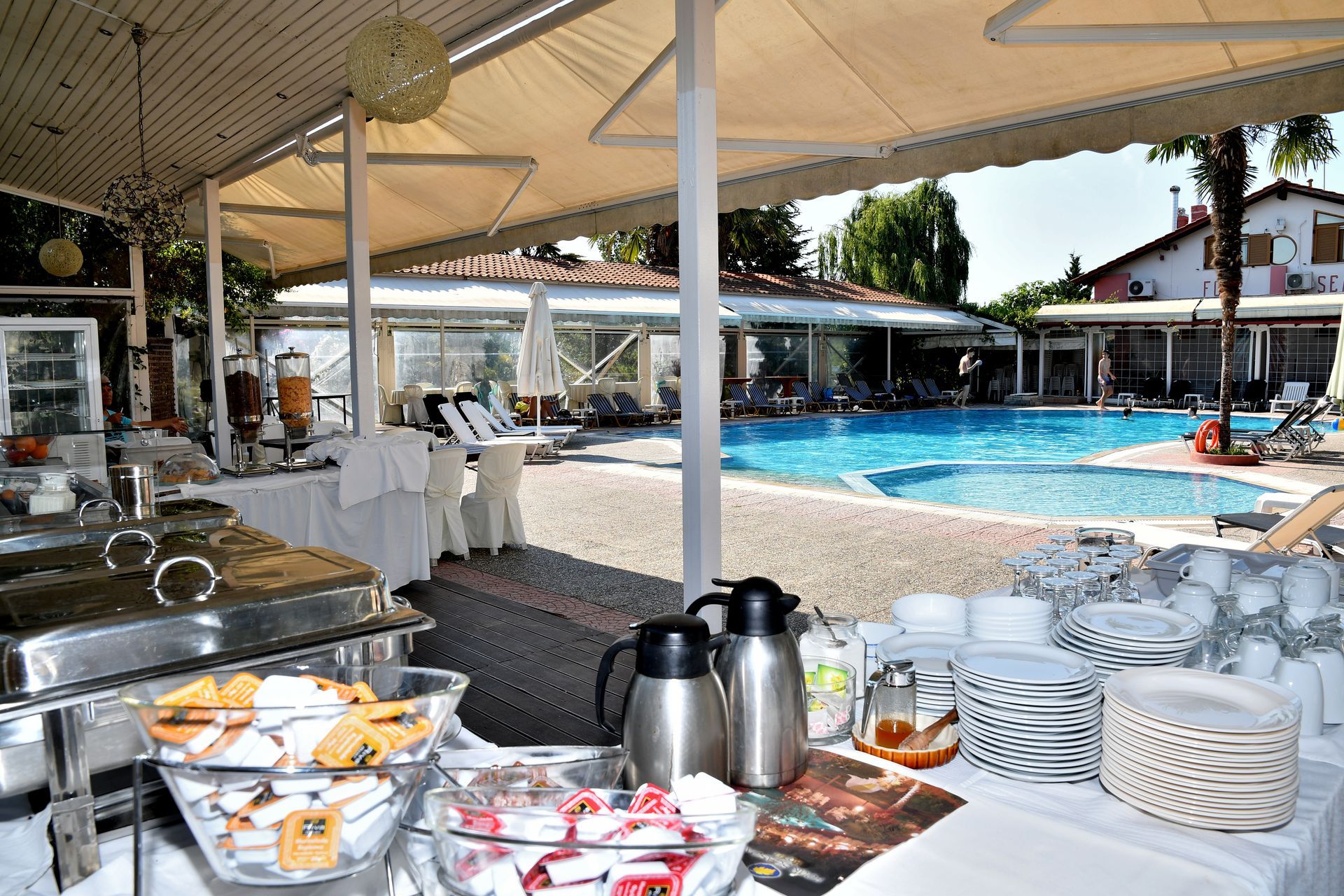 Σε έναν πανέμορφο εξωτερικό χώρο γύρω από την πισίνα αλλά και σε έναν ιδιαίτερο εσωτερικό χώρο (περιτριγυρισμένο από τζαμαρίες που προσδίδουν άνεση και φωτεινότητα), είμαστε στη διάθεσή σας, ανεξαρτήτου εποχής ή καιρικών συνθηκών.